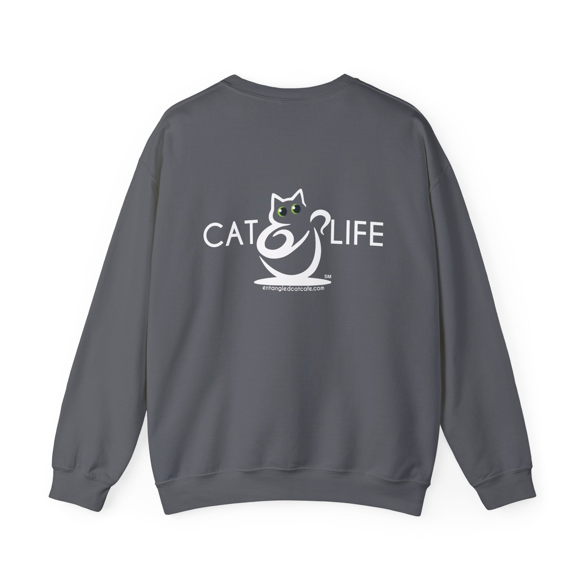 A cozy and stylish unisex sweatshirt featuring the Entangle cat cafe logo on the front and Cat Life large on the back. Perfect for cat lovers who enjoy a trendy and comfortable look. Ideal for casual wear, lounging at home, or visiting cat cafes.